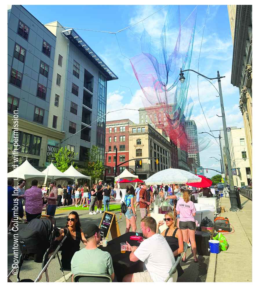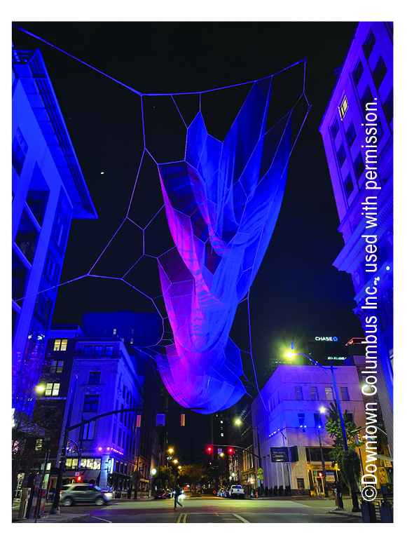 Created by artist Janet Echelman, the 229-foot, vibrantly colored, floating fiber sculpture, first installed in 2023, symbolizes the “current” of energy, the Scioto River and the city’s history as a hub for electric, gas-lit archways. The sculpture connects the city’s historic, red-brick, urban grid with its revitalized riverfront.