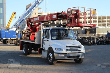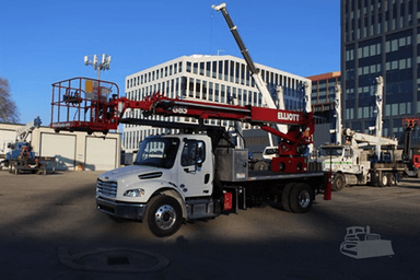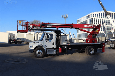 Standard features: Our new Elliott HiReach G85R, having an 87’ working height. Basic unit includes base assembly supporting rear mounted rotating turret, hydraulically powered continuous rotation mechanism, oil reservoir mounted to truck frame, oil and manual hydraulic controls mounted to turret. Electronic proportional three stick remote controls on platform. Base mounted “MH" type hydraulically powered, individually controlled rear main outriggers and “A” secondary outriggers behind cab. High strength steel four section hydraulically telescoping boom with one double acting 7” lift cylinder plus (1) 2 ½” piggyback and (1) 3” extension cylinder. Two cable carriers to boom tip with covers. Electronic self-levelling and rotating 40” x 60” EZR work platform with remote levelling from platform and aluminum floor. Power take off and pump drive, pressure gauge, pump and holding valves on all cylinders. Remote start/stop at upper and lower controls, 12-volt emergency pump with switch at upper and lower controls. PTO hour meter, backup alarm, fire extinguisher, safety triangle kit, and two body harness and lanyards. LED lights to include all bed marker lights, stop, tail and turn. Installed on chassis, tested and ready to operate. Unit certified to ANSI A92.2 for Vehicle-Mounted Elevating and Rotating Aerial Devices. Platform capacity 500 lbs. Additional Options: • 16’ steel bed with LED lights and Grip Deck Coating • Stand Rear Bumper with Steps and Grab Handles • Automatic Rotation Lockout – Prevents Boom from Rotating to Side where MH Outriggers are not fully extended Horizontally (“A” Outriggers Remain Fully Extended) • 5,900 lb. Planetary Winch with Anti-Two-Block Switch, Horn, Two Part Hook & 180’ 3/8” Cable & Retainer Lug • 500 lb. Platform Mounted Jib with hydraulic Winch, Jib Stows in platform • 110 Volt Line to Platform • (2) Sign Forks on Platform • Hot Shift PTO for Automatic Transmission • 98” x 36” x 24” Steel Crossbody Box (Requires 2” shorter bed) • (4) 24x24x1 Composite Plastic Outrigger pads w/2 steel holders • Welder/generator Start/stop switch in Platform • Welder Leads to Platform – (2) 1 Gauge Cables • 1Oxy/Acetylene Bottle Holder on Bed • HiReach Unit Painted Red, Subframe Painted Black, Outriggers Painted Red (STD) MOUNTED ON 2025 Freightliner M2 106 Mounted on a 2025 Freightliner M2-106 truck chassis with a 260 HP Cummins B6.7 diesel engine, AF Allison 2500 RDS automatic transmission, Detroit DA-F-13.0-3 13,000 lb. front axle, Detroit DA-RS-20.0-4 20,000 lb. rear axle, 50 gallon aluminum fuel tank (LH), AM/FM radio, cruise control, air conditioning, Color white.